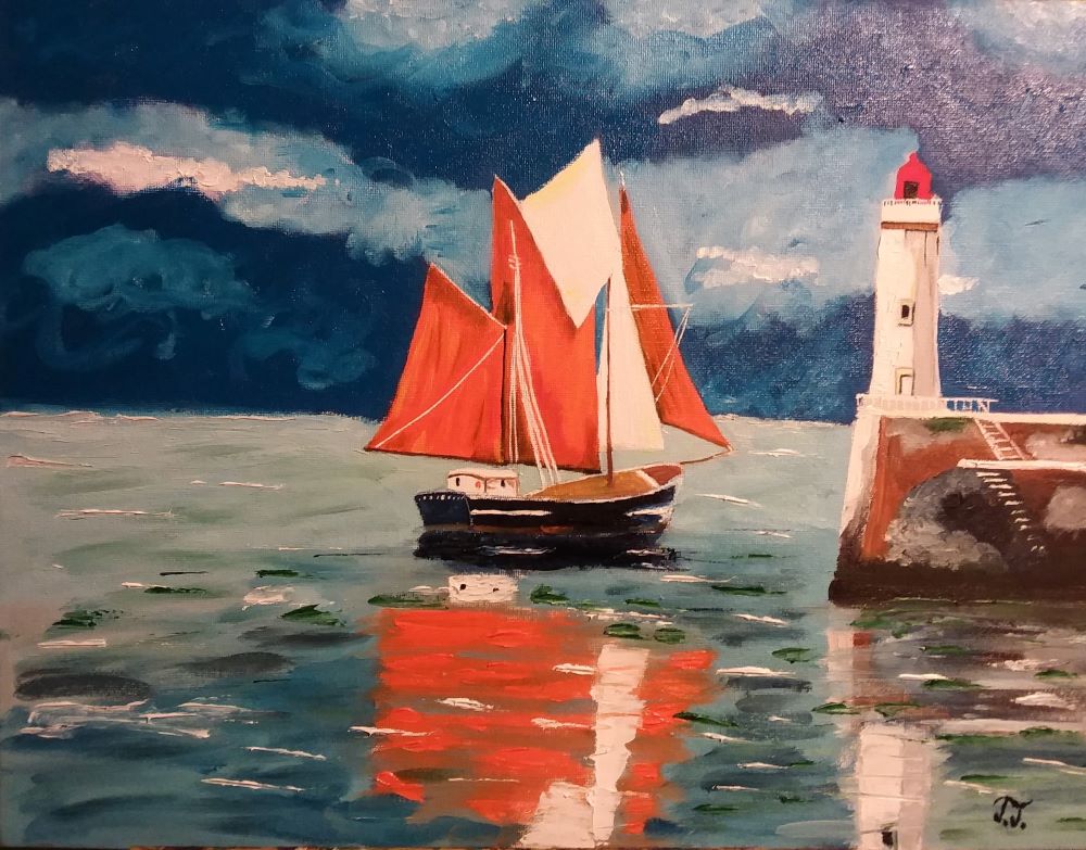 This painting presents a stunning scene of a sailing ship making its way toward a lighthouse. Every brushstroke in this oil painting reflects the passion and fascination I feel for sailing and ships. The view of the Balaton or seaside harbours, where elegant sailboats and yachts gently sway, has always been a source of inspiration.