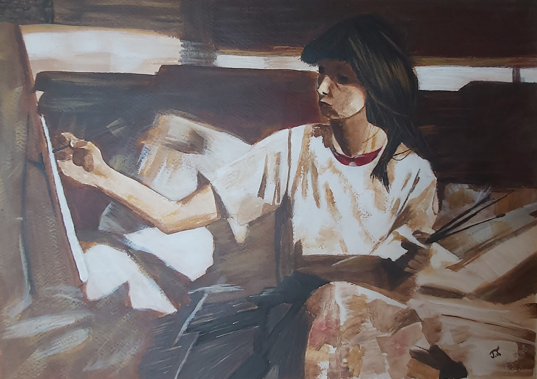 Ez a festmény egy szobabelsőbe vezet, ahol egy művésznő elmélyülten dolgozik legújabb alkotásán. A monokróm technika és a barna különböző árnyalatai egy különleges, időtlen atmoszférát teremtenek, amely a csendes alkotás pillanatát örökíti meg. Az alkotó akár én is lehetnék, hiszen az ecsetvonások és a színek mögött ott rejtőzik a művész lelke és személyes története.
