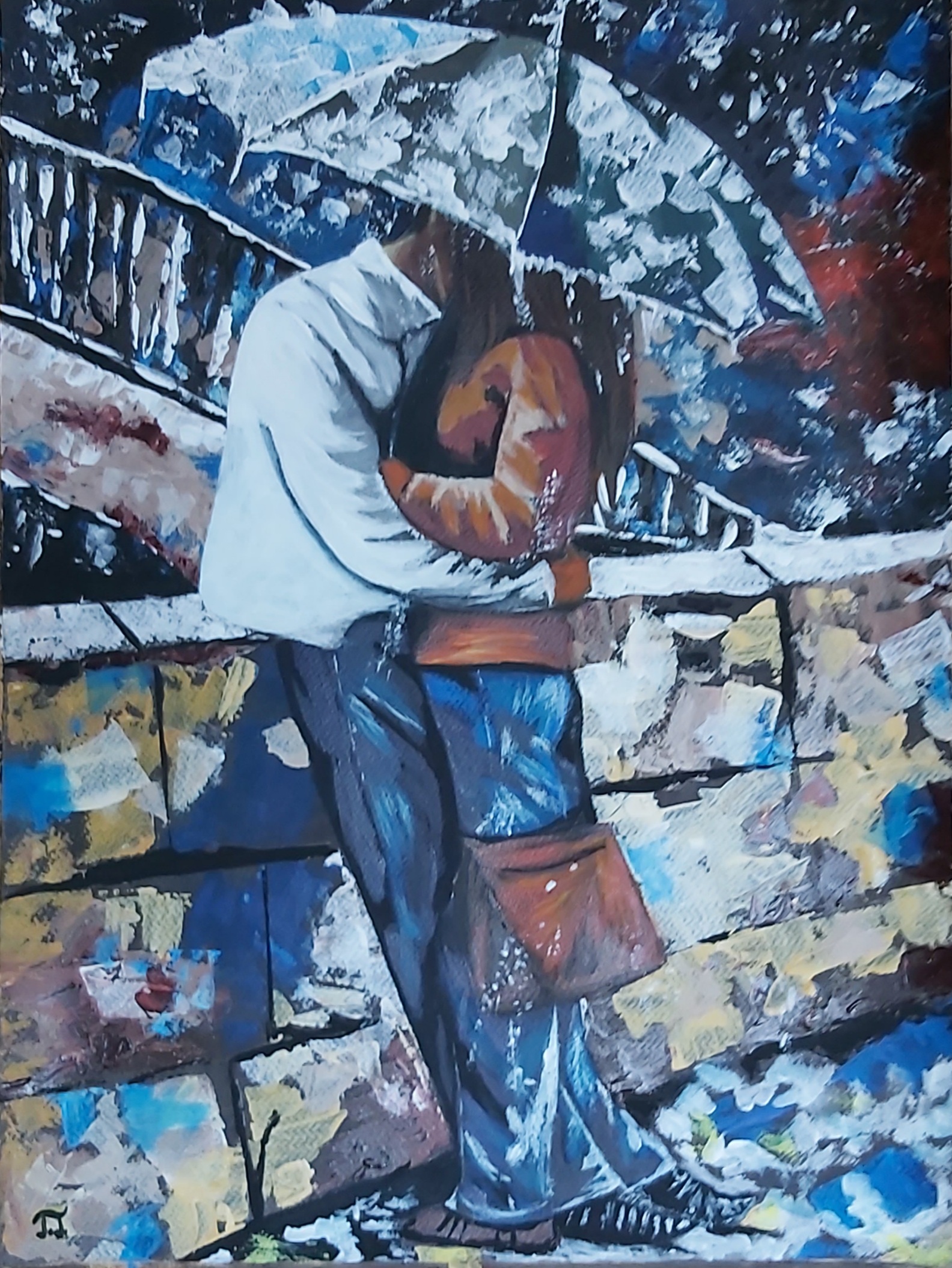 Ahogy festettem ezt a képet, az volt a célom, hogy megragadjam azt az érzést, amikor az idő megáll, és csak a jelen pillanat létezik. Az eső lágy koppanása az esernyőn és a folyó halk morajlása egy csendes háttérzenét ad a pár intimitásához. Az ecsetvonásokkal igyekeztem érzékeltetni az eső frissességét és az ölelés melegségét, amely átjárja a nézőt.