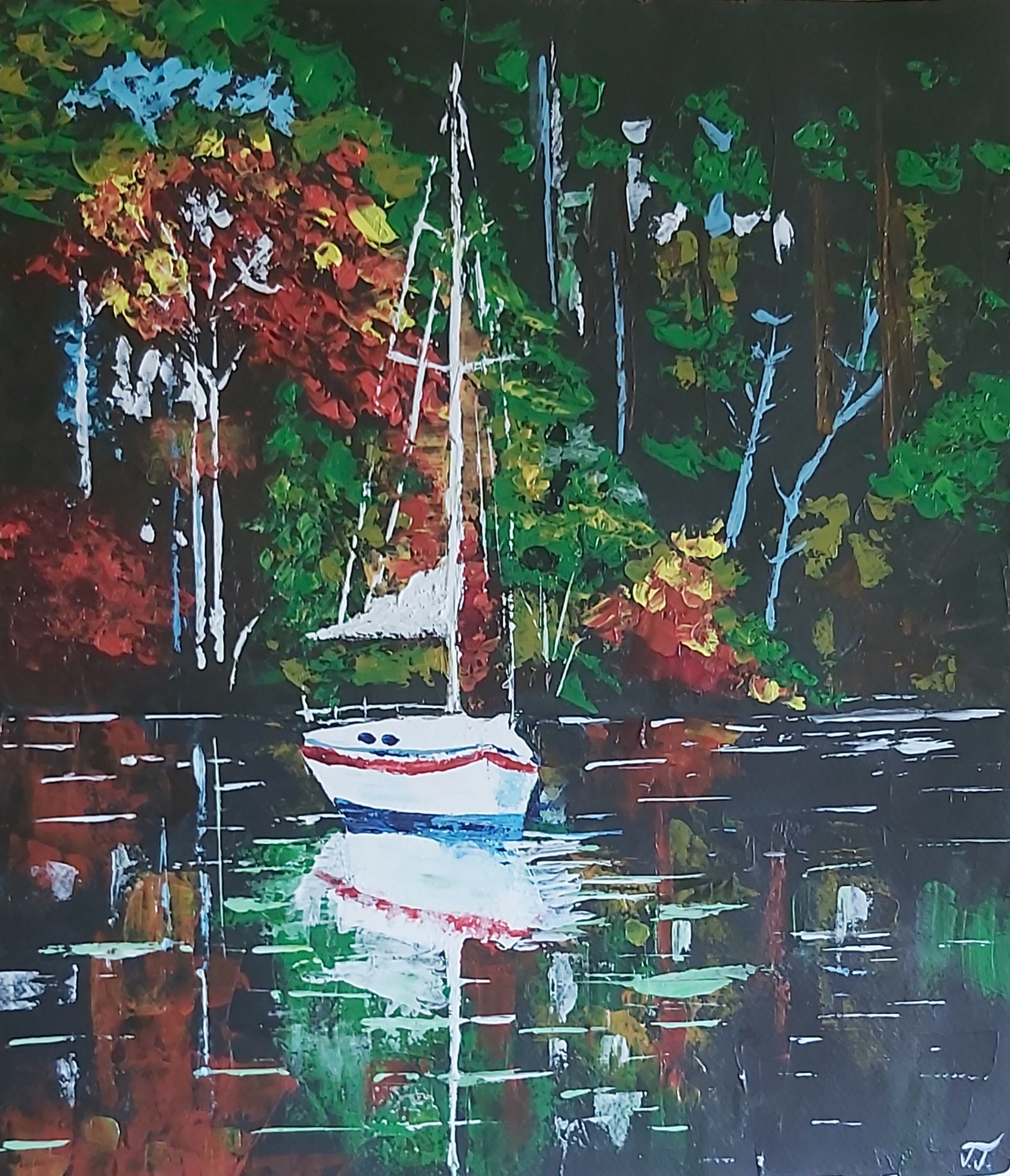 Ez a festmény egy tanulmánykép, amely Afremov inspirációjára született, és célja, hogy megragadja a színek és a fények játékát a víz felszínén. A csónak, amely csendesen ring a vízen, a magány és a belső béke szimbóluma. A háttérben a természet színei – az élénk kékek, a ragyogó sárgák és a mély vörösek – harmonikus táncot járnak, amely szinte életre kelti a tájat.